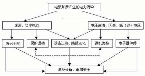 在熔化期三相不平衡电流含有较大的负序分量。当一相熄弧另两相短路时,电流的基波负序分量与谐波的等值负序电流可达正序的 50%~70%。这将引起公共供电点的电压不平衡,对电机的安全运行影响较大,尤其对大电机的影响更为严重。