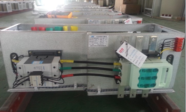 抽屉式模块上已安装有所需容量的电容器(和电抗器)、接触器、可控硅动补开关、控制端子排、垂直母线、母线架、母线熔断器式隔离开关。整块板自成系统,通过进线口、控制器接口和电流互感器接口与周围系统连接。